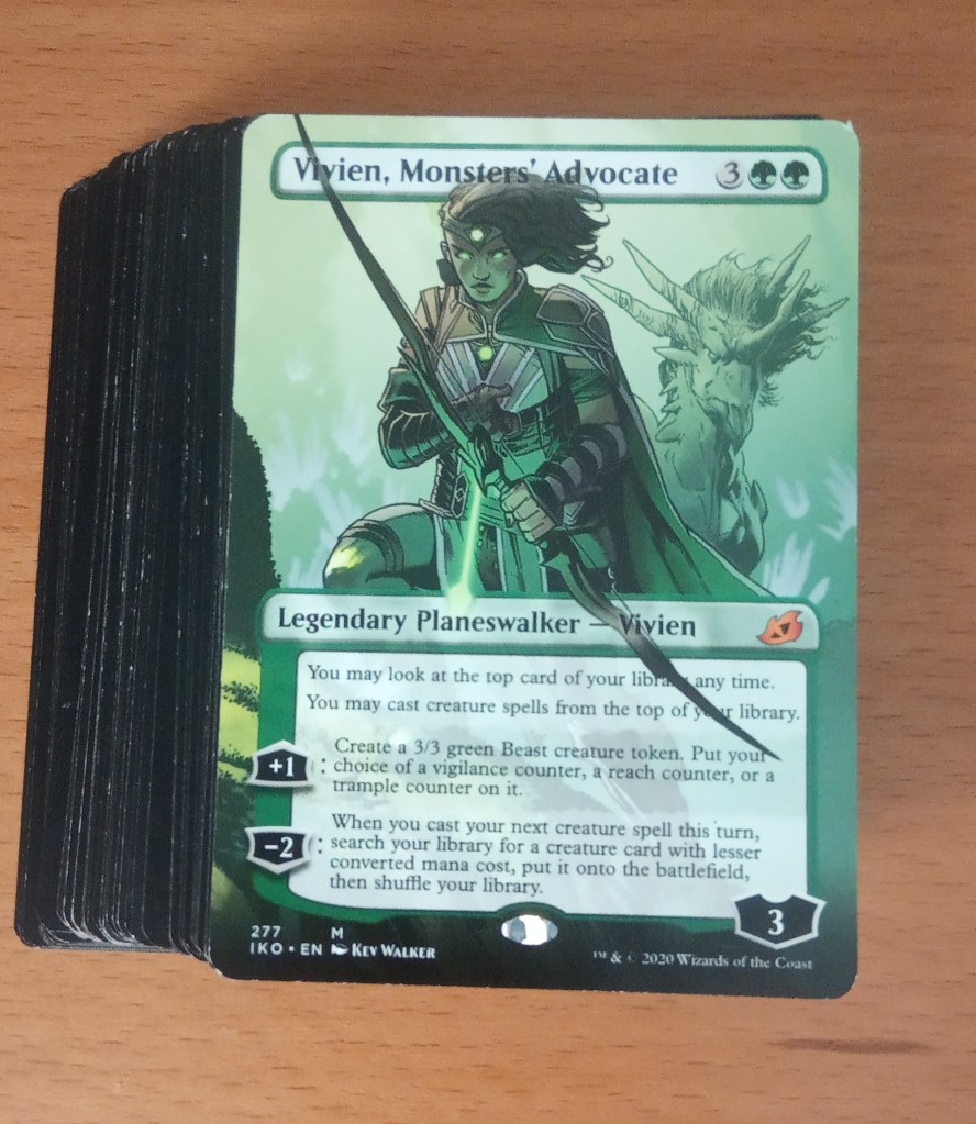 Vivien is the most expensive card in Ikoria, and is one of the three planeswalkers too. Her +1 ability to create 3/3 beasts non-stop is hard to beat when they are coming out every turn, including the turn she is played! As well as that, you can look and play the top card of your library (if it is a creature) and put creatures from your deck onto the battlefield!