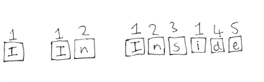 Now look at the second string. the possible letters that 2 could be are f and n (this is an easy puzzle, i wouldn’t put abbreviations in it, if you were thinking q) if it was f, you would have to have ifsid on string three, so it wouldn’t work. you could have n because you you could spell inside on the third string, making the 5 an e. here is what the completed puzzle would look like: